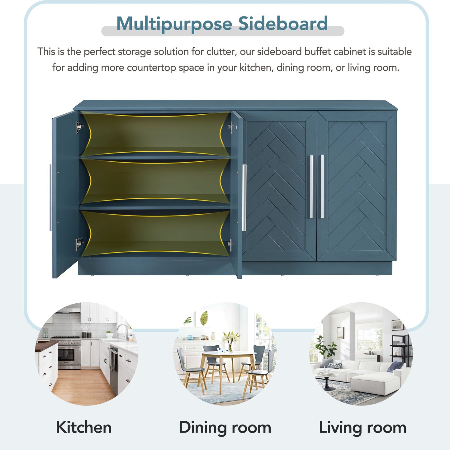 Elevate your home’s style and organization with this Modern 4-Door Buffet Sideboard Cabinet. Designed with clean lines and a chic striped texture, this piece perfectly balances functionality and timeless elegance. Available in antique blue, white, or black, it adds a refined touch to any kitchen, dining room, or living space. Crafted from high-quality MDF, the cabinet ensures excellent stability and durability, while its painted finish resists scratches, moisture, and wear for long-lasting beauty. Behind the four sleek doors, adjustable shelves offer flexible storage for dishes, serving ware, or household essentials. The spacious 60’’ wide top surface provides additional display or prep space — ideal for showcasing decor, hosting dinnerware, or organizing daily necessities. Accented with silver-finished handles, this sideboard brings a bright and luxurious aesthetic to your interior. It’s a perfect combination of style, functionality, and quality craftsmanship, designed to make every room more beautiful and practical.